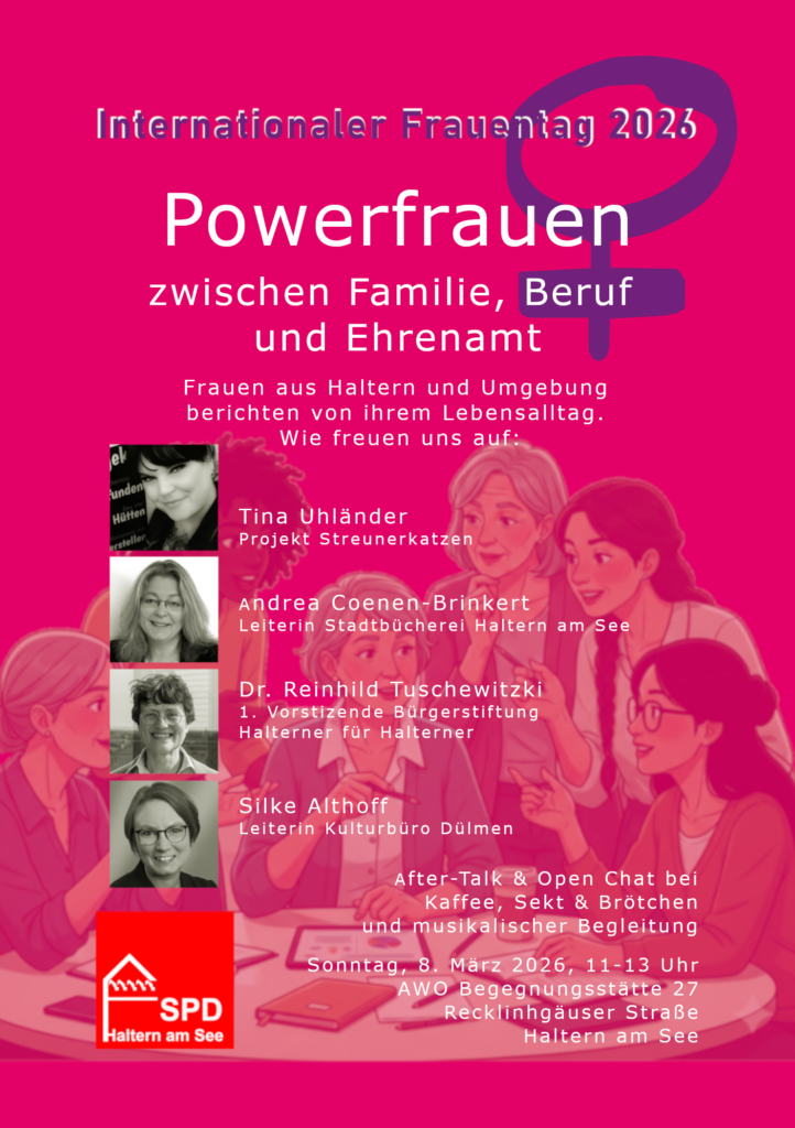 Mit Tina Uhländer vom Streunerkatzenprojekt, Stadtbüchereileiterin Andrea Coenen-Brinkert, Dr. Reinhild Tuschewitzki von der Bürgerstiftung Haltern am See und Silke Althoff, Leiterin des Kulturbüros in Dülmen, haben wir echte Powerfrauen gewonnen, die von ihrem täglichen Spagat, genügend Zeit für die Familie zu haben, den beruflichen Anforderungen gerecht zu werden und sich gesellschaftlich zu engagieren, berichten werden. Nicht immer findet Engagement Unterstützung und Wertschätzung. Da müssen wir ran.
